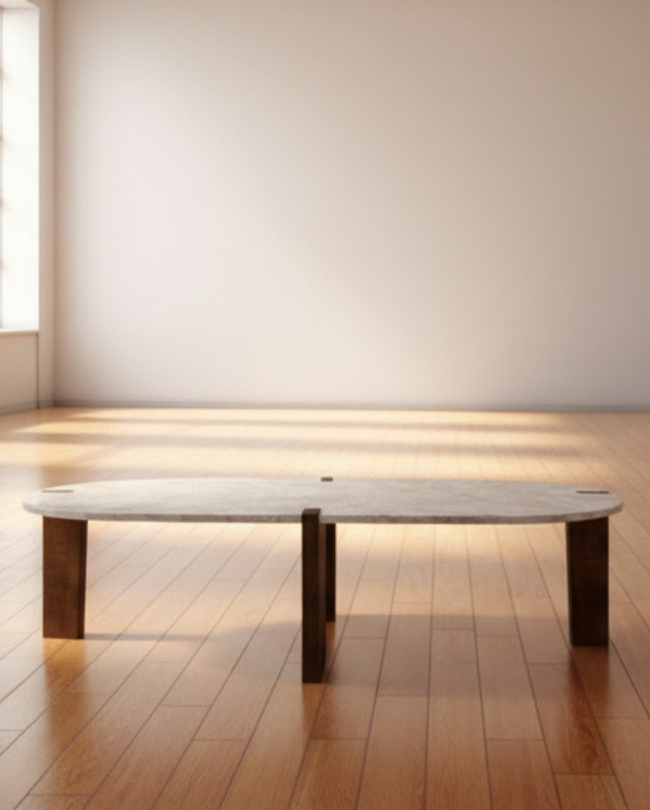This unique oval-shaped coffee table features a striking design with cut-out legs made of solid oak, paired with a luxurious wrapped Bianco color folks marble top. Crafted from high-quality MDF and wrapped for exceptional durability and weather resistance, this table is hand-built by South African artisans to ensure lasting quality.