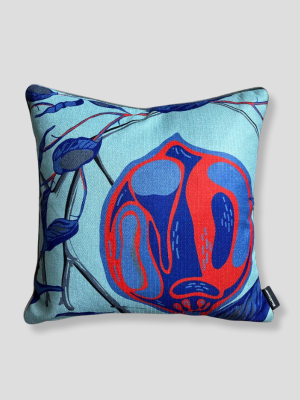 No. 6 of 6, a curated cushion from our exclusive Endless Summer collection. Printed locally, this design reimagines tropical fruit and foliage in vivid blue and crimson — a modern take on organic form and summer energy.